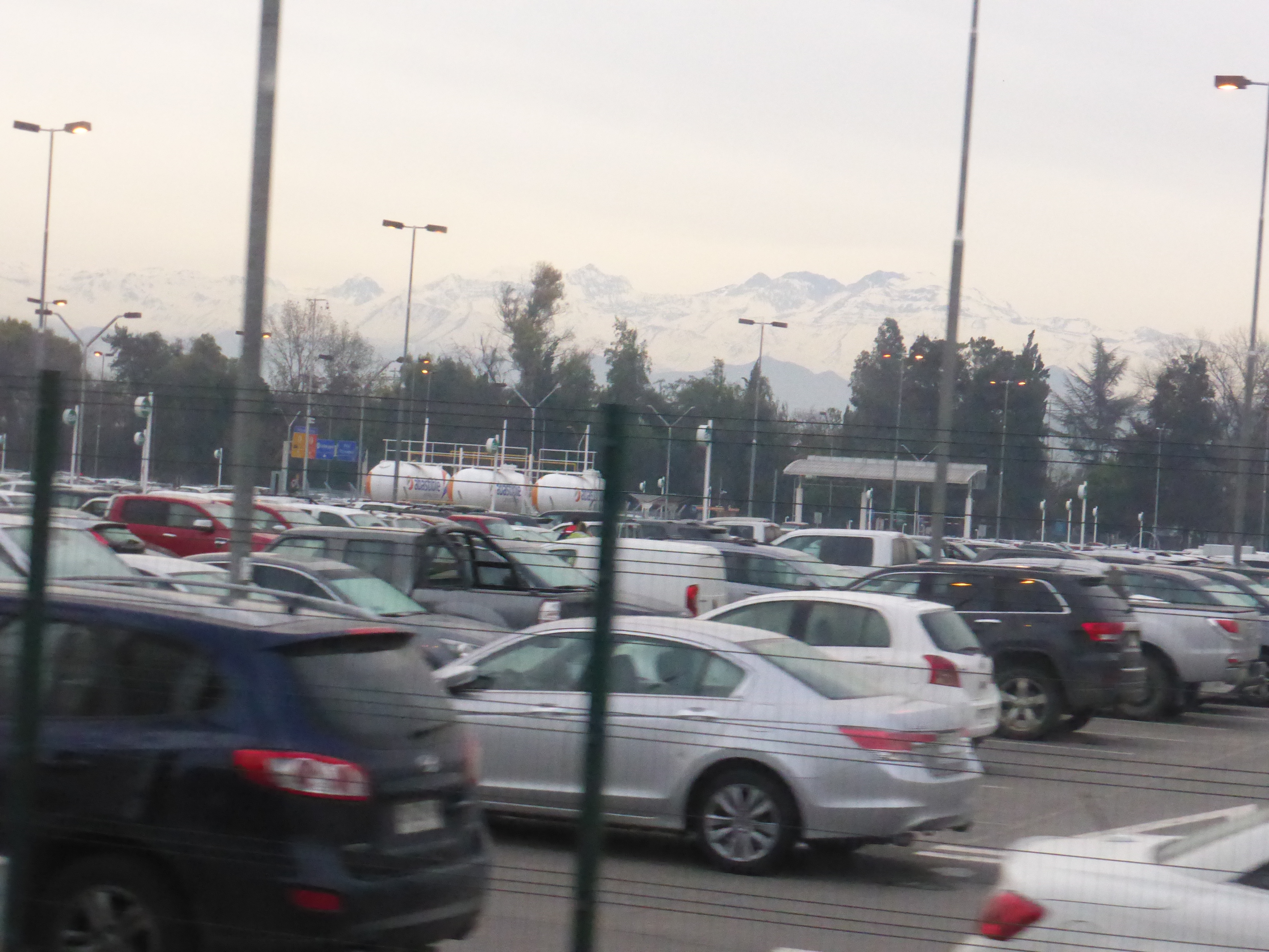 Soon after midnight, dinner was served on the flight and there was various in-flight entertainment available. In the early hours the lights were dimmed to enable people to sleep, Fortunately Olly and myself had three seats between the two of us and so we could try to get a little more comfortable and we both managed patches of sleep as the night progressed. The long, long night appeared to go on for ever – and travelling virtually all of it in the darkness of night. A couple of hours before landing another meal was served before we finally landed at Santiago Airport a little before 08:00 – just as the day was starting to get light.