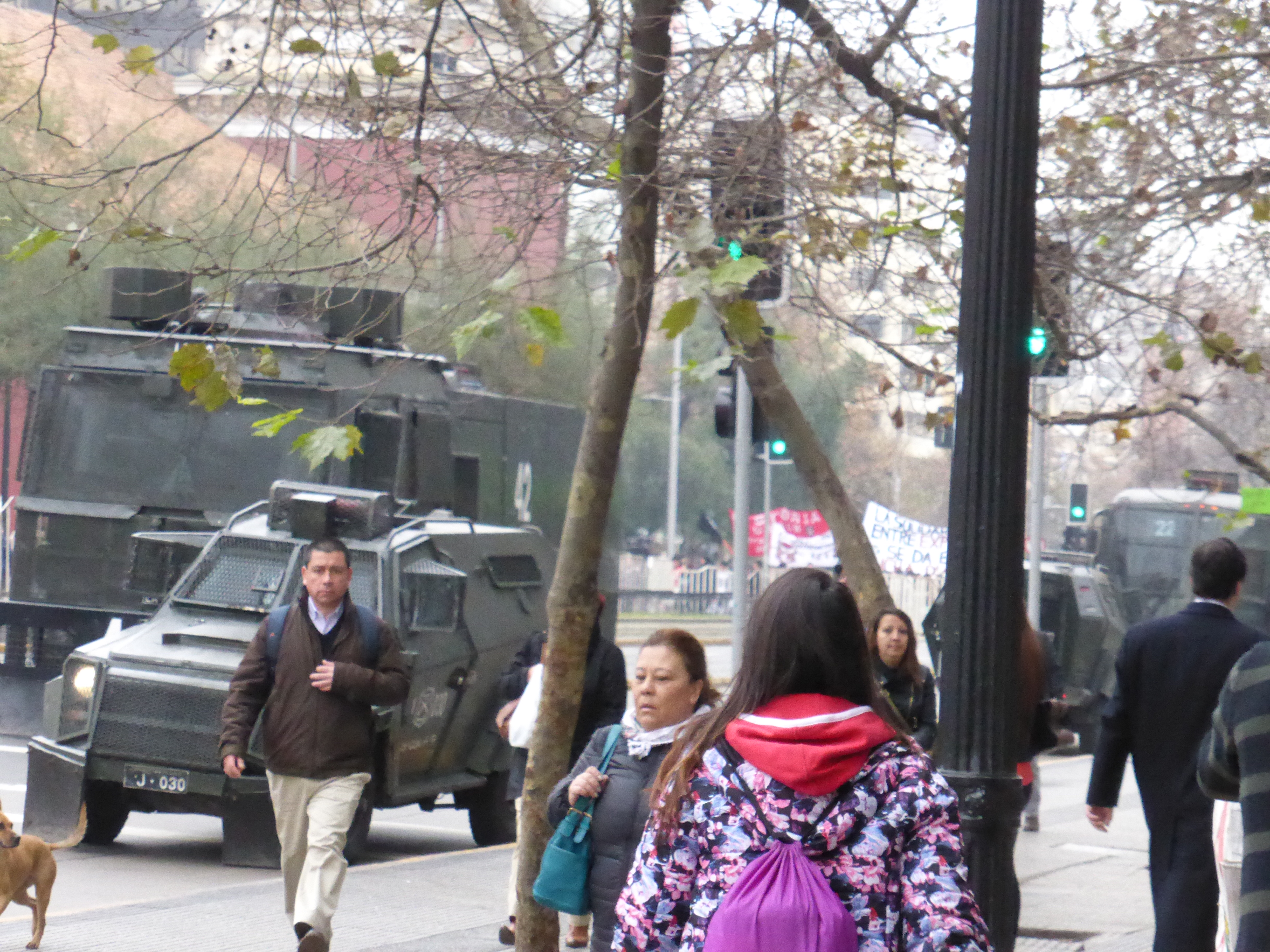 We continued to walk along the avenue and passed several other groups protesting as they walked along. It was also noticeable that there were many groups of Carabineros police along our route – and several heavily protected police vehicles too!