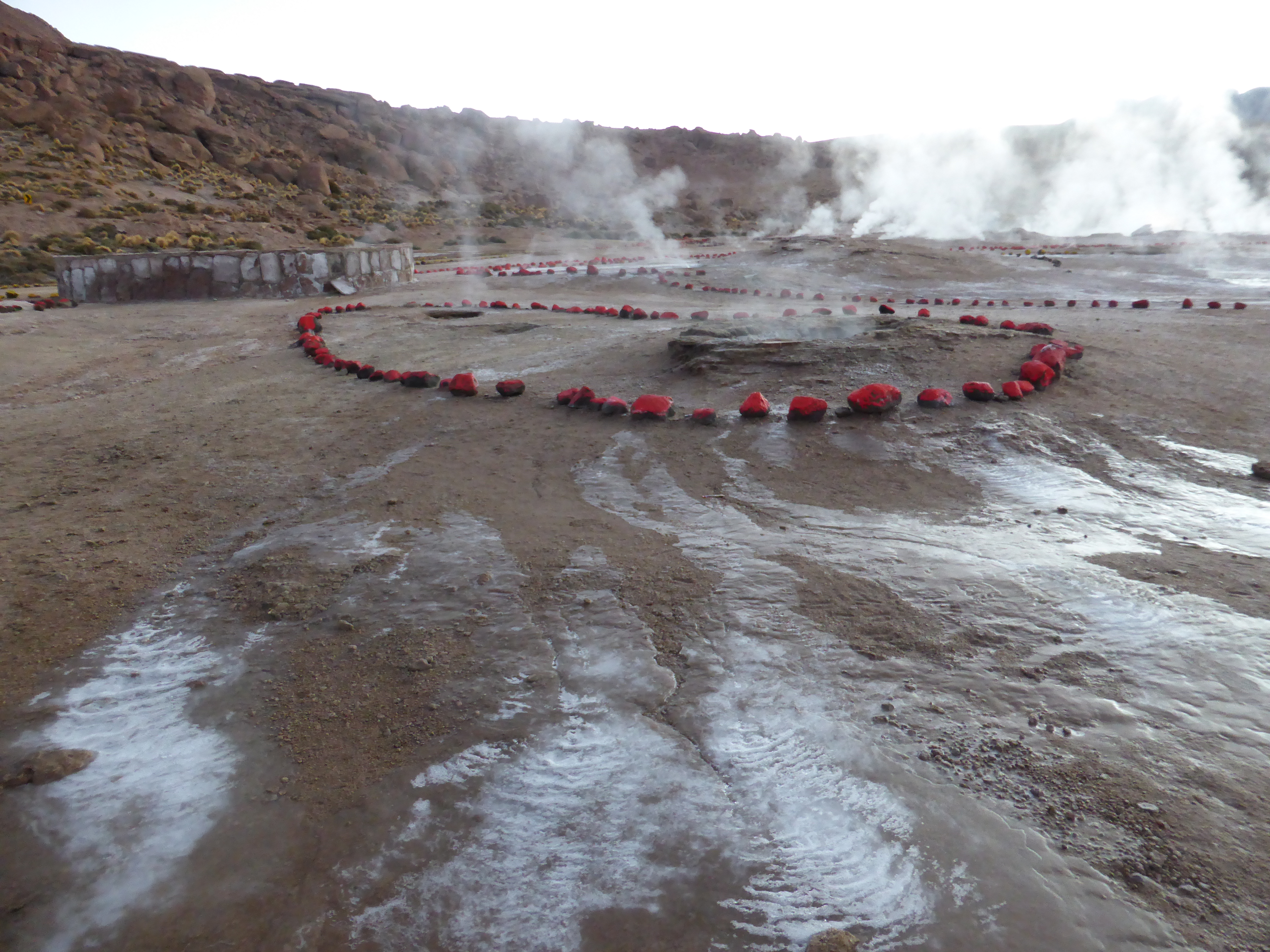 Within minutes we stopped at a small parking area where we had to pay our entry fee before returning to the minibus and moving on a short distance. There, in the near darkness, the grey steam could be seen leaving the ground and floating into the air. We were now at 4,320 metres (14,173 feet) above sea level, the temperature was -7C and there were clearly reduced levels of oxygen in the air.